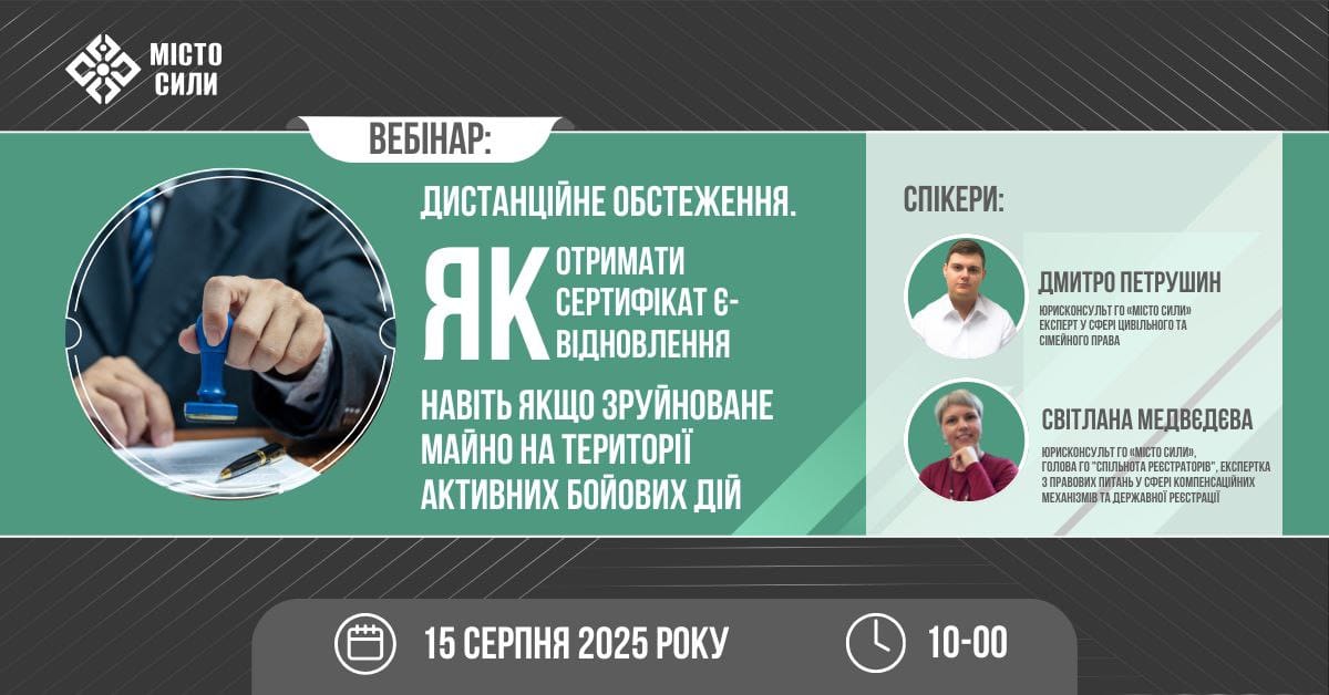 15 серпня о 10:00 Громадська організація “Місто Сили” запрошує на безкоштовний вебінар на тему ” Дистанційне обстеження. Як отримати сертифікат Є-відновлення, навіть якщо зруйноване майно