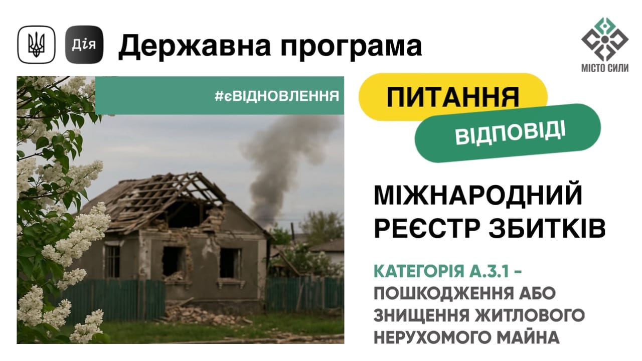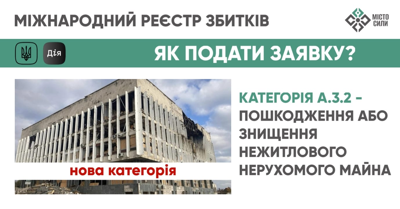 Якщо Ви власник пошкодженого або зруйнованого нежитлового майна, зверніть увагу!У Міжнародному реєстрі збитків відкрито ще 1 категорію заяви – A.3.2, щодо нежитлової нерухомості, знищеної або