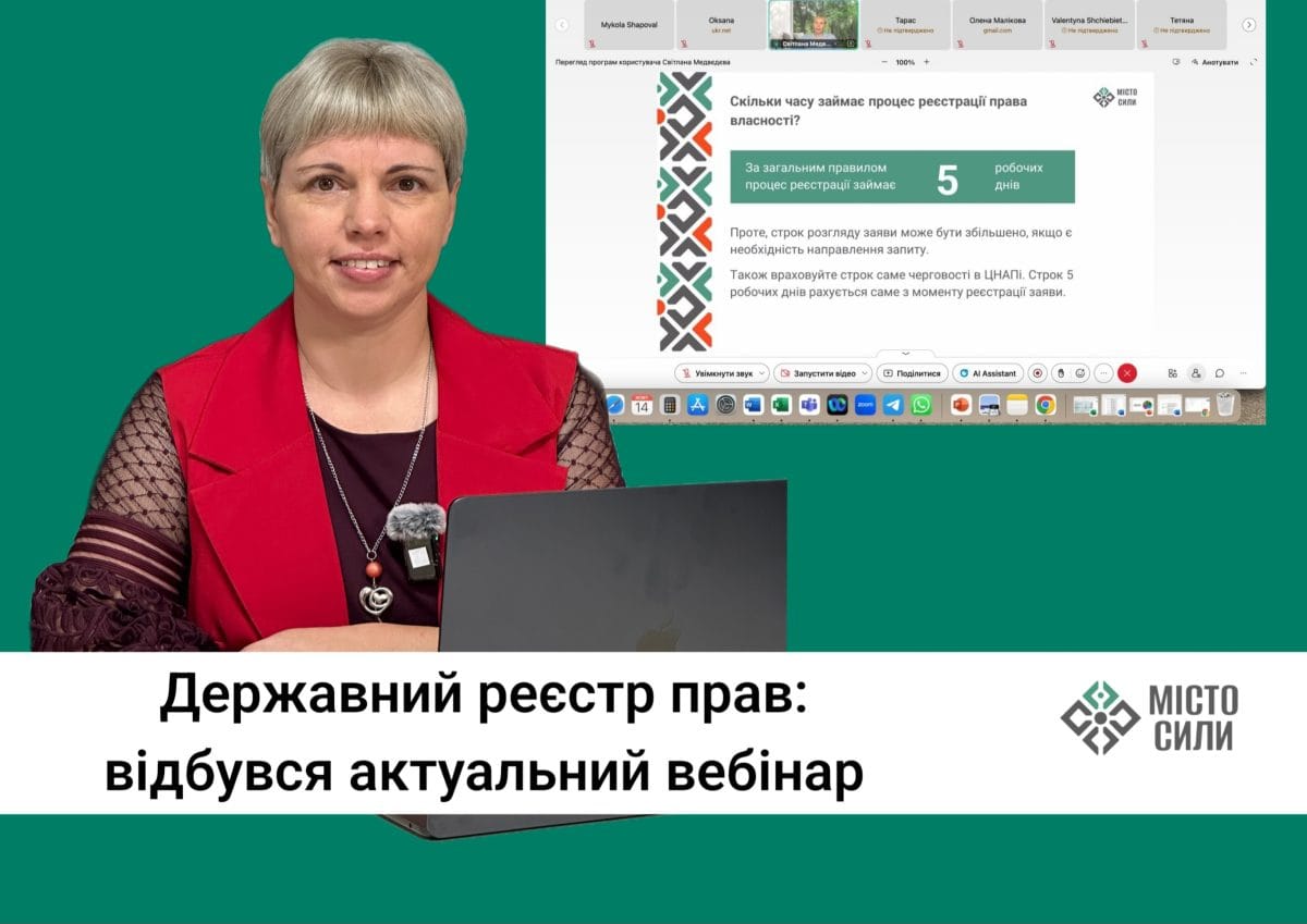 14 жовтня Громадська організація “Місто Сили” провела вебінар щодо реєстрації права власності у Державному реєстрі. Онлайн-захід відвідали понад 130 учасників.